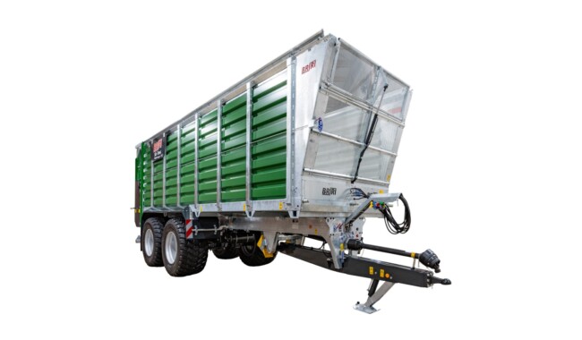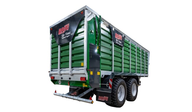 Wagon de transport de copeaux BRIRI Silo-Trans - Le wagon de transport de copeaux est disponible en version tandem avec un volume de chargement de 45 m³ ou en version tridem de 52 m³. Il est contrôlé via les unités de commande du tracteur ou l'ISOBUS optionnel. Le véhicule peut être utilisé en option comme système de plateforme interchangeable avec un épandeur universel ou une citerne à lisier.
